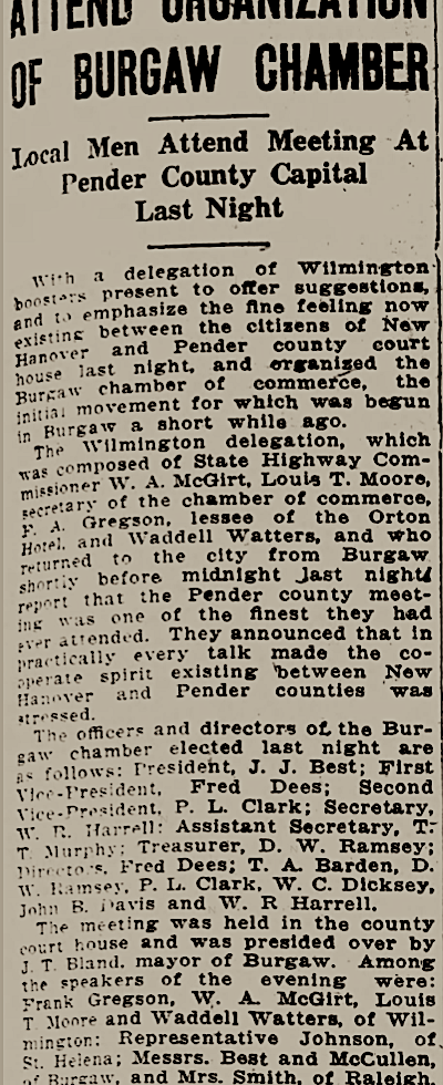 The Burgaw Area Chamber of Commerce (BACC) officially began in 1982. However, its roots can be traced all the way back to April 11th, 1922, when the Wilmington Morning Star detailed a meeting that took place between the Burgaw Chamber of Commerce and its’ Wilmington equivalent. Emphasizing the positive relationship between Pender and New Hanover County, the article quotes Waddell Waters (NHC), who calls the meeting “one of the finest [he] had ever attended”(Figure 1). The history of the BACC winds and weaves from there, with mentions of various, similarly-named organizations being made in both 1940 & 1952. In a December 5th, 1940 publication of The Pender Chronicle, E. M. Thompson is credited with leading a committee of five other men in organizing the Pender County Chamber of Commerce, “an agency, which it is hoped will function in a large way in the promotion of the interests of the county” (Figure 2). The August 14th, 1952 issuance of the same paper notes the founding of The Burgaw Junior Chamber of Commerce, or, as they were commonly called, the ‘Burgaw Jaycees’: a group of civically-minded, young men whose purpose was community improvement and “boosterism” (Figure 3). With much of the details lost to history, we are left to wonder how the various transitions happened throughout the years. The Chamber’s commitment to service, however, has never been in question -- with a mission consistently centered on enhancing the area’s economic growth and helping local businesses prosper.